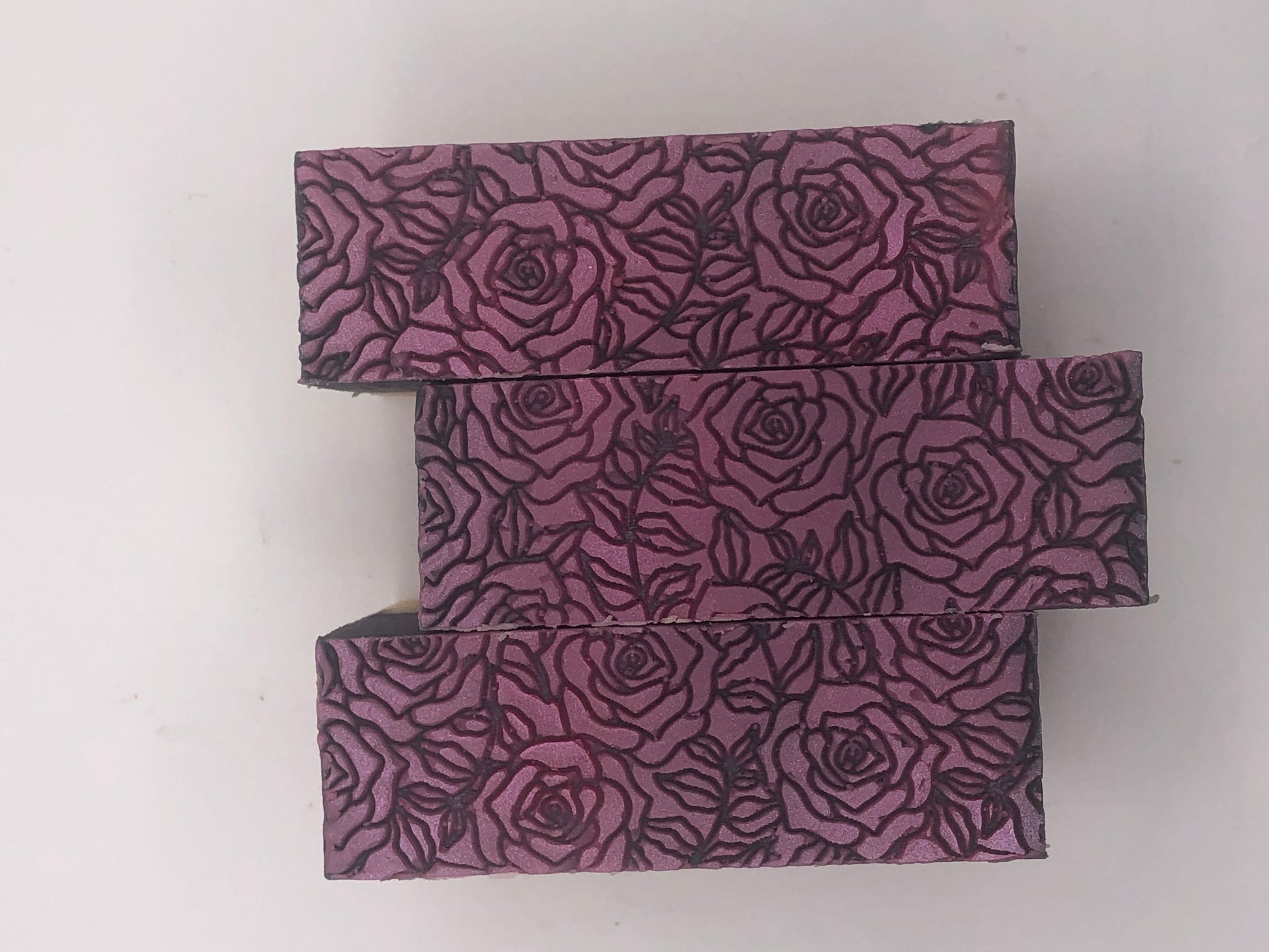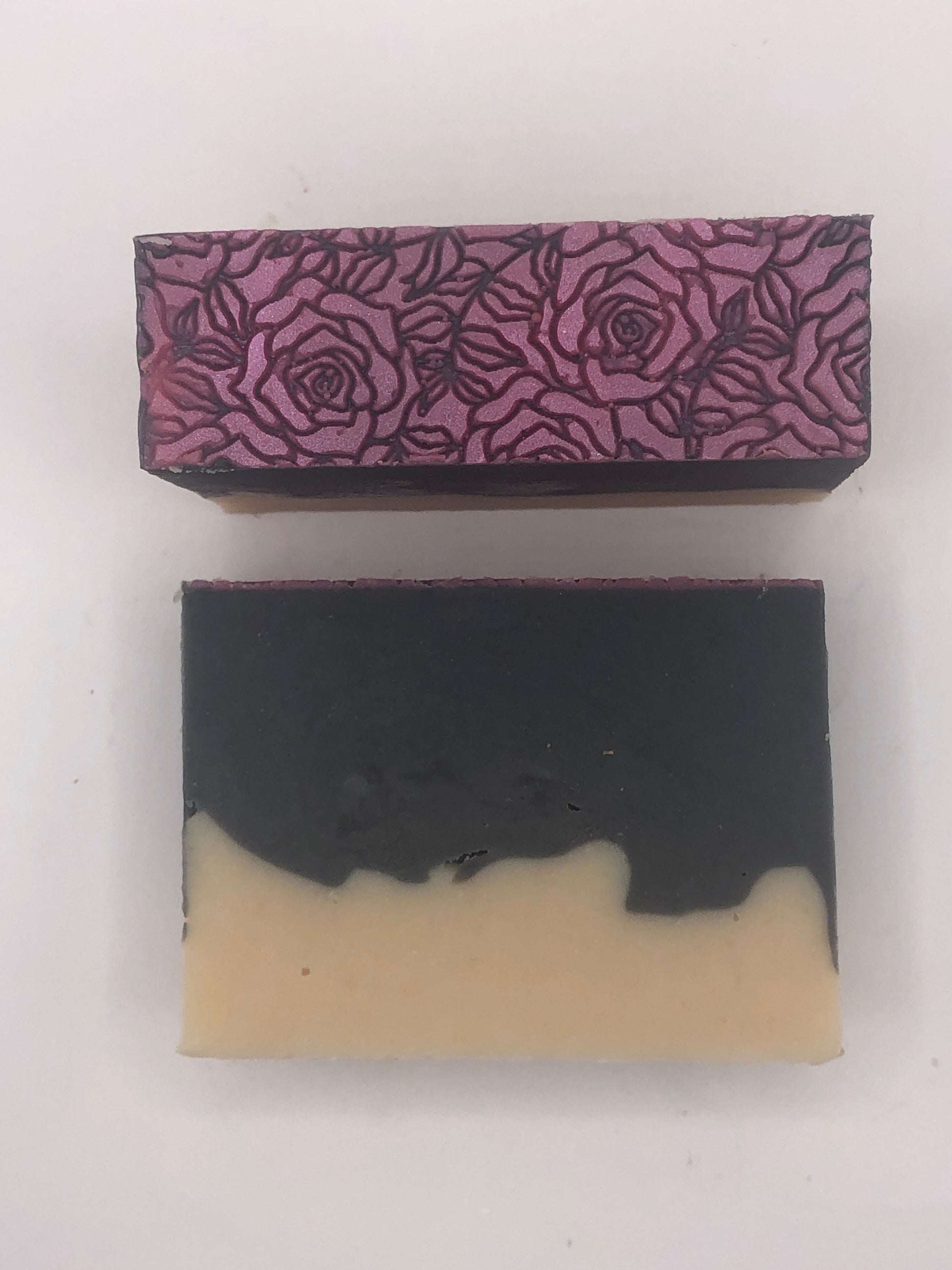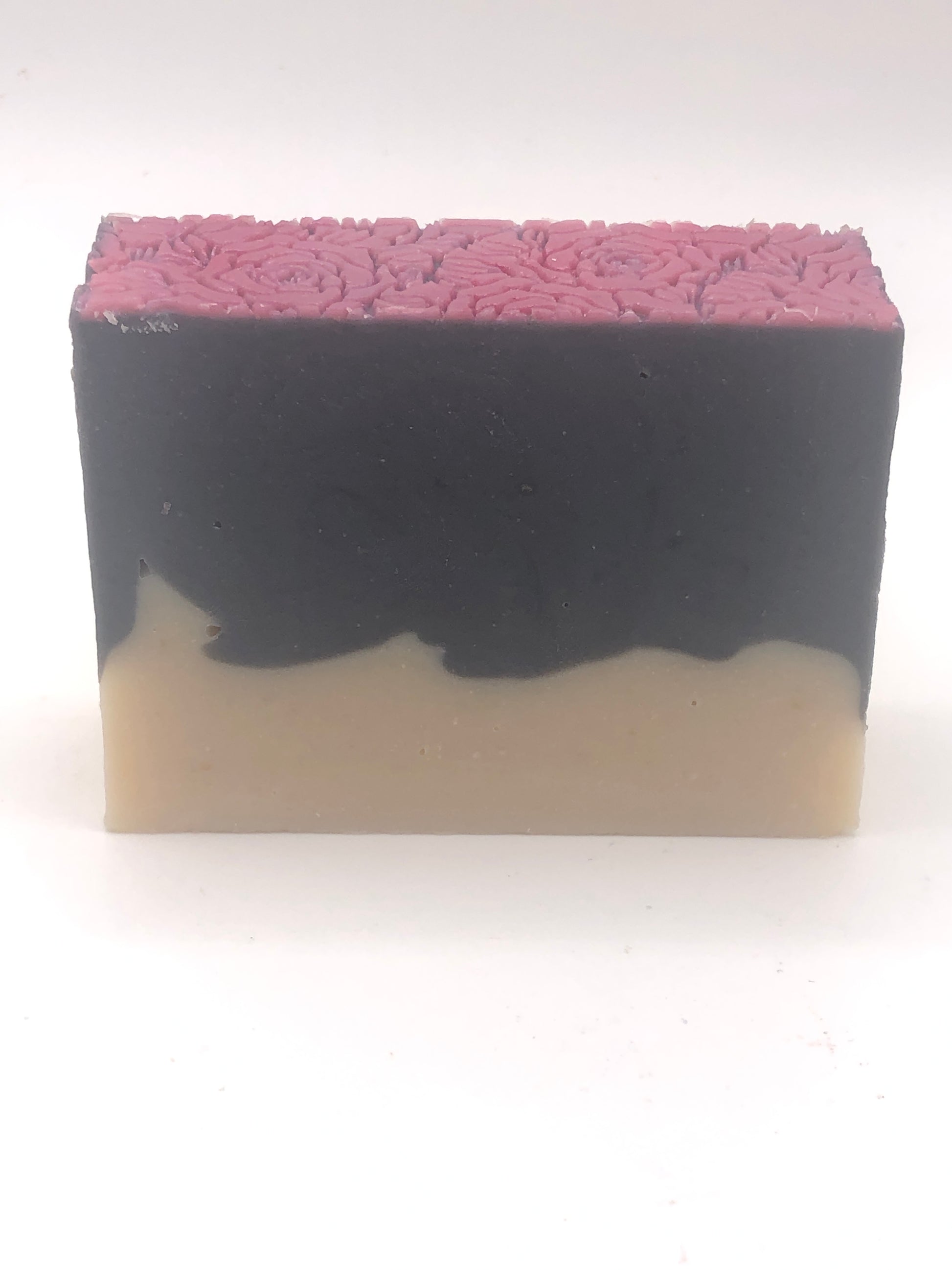 It is scented with a bright and nuanced rose scent along with a touch of patchouli to give it depth. The colors come from activated charcoal along with pink mica. And there is added sparkle and texture from the rose pattern on the top of the soap.
