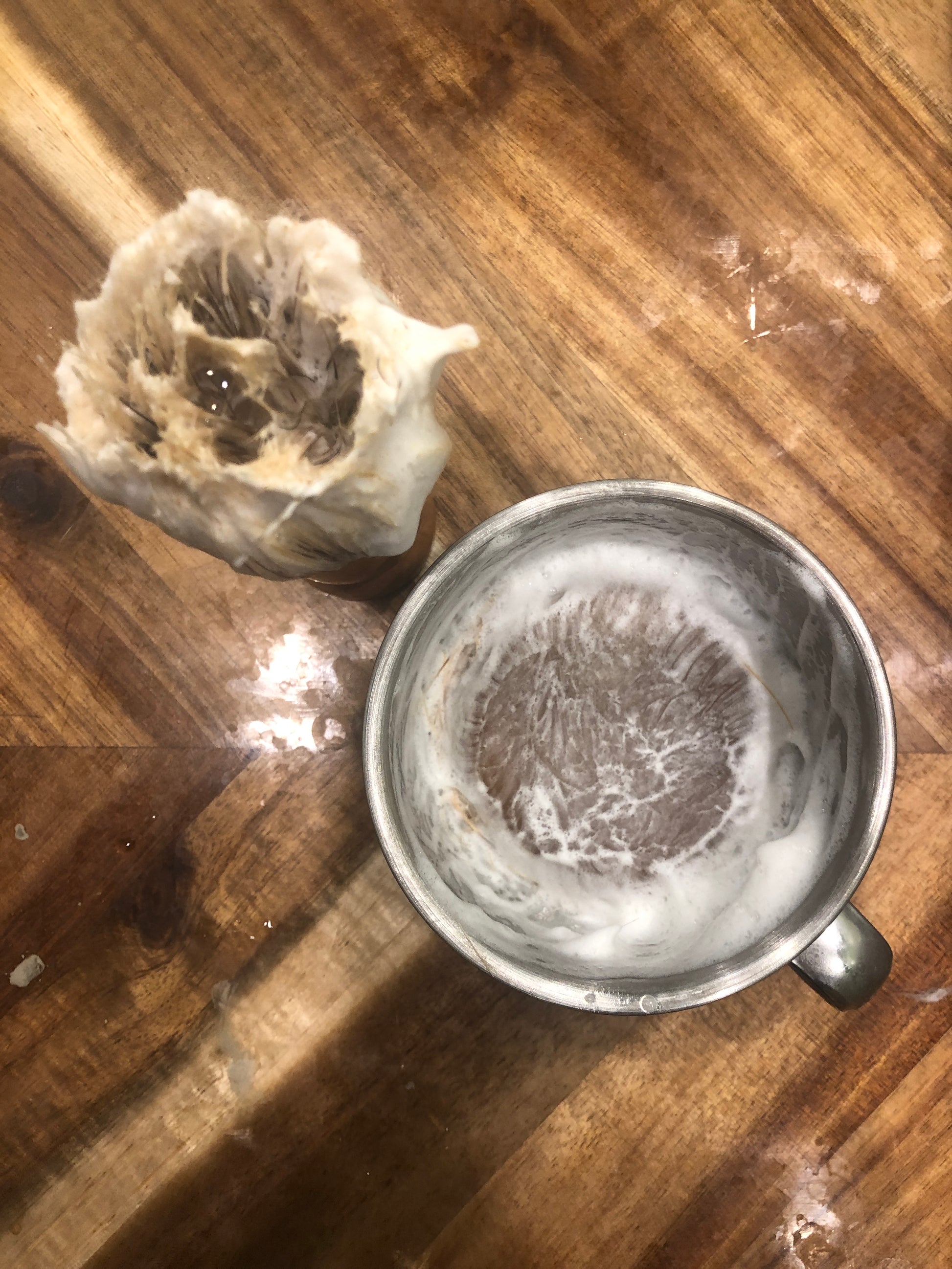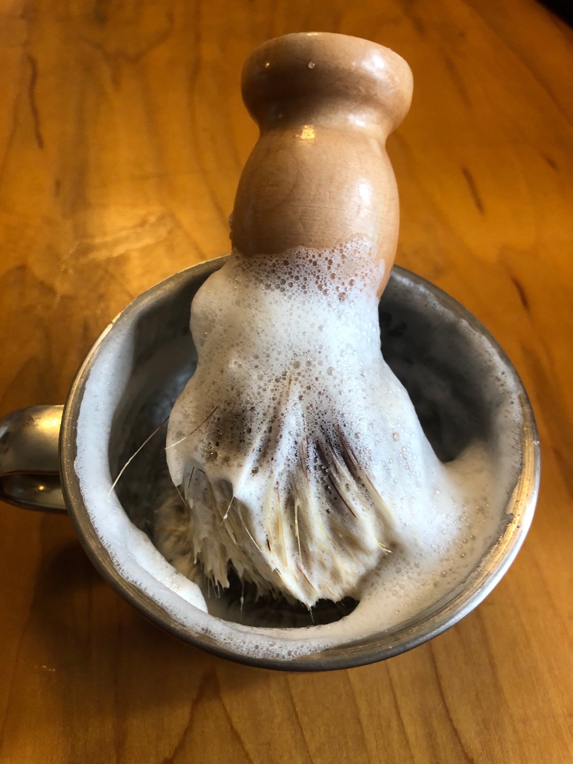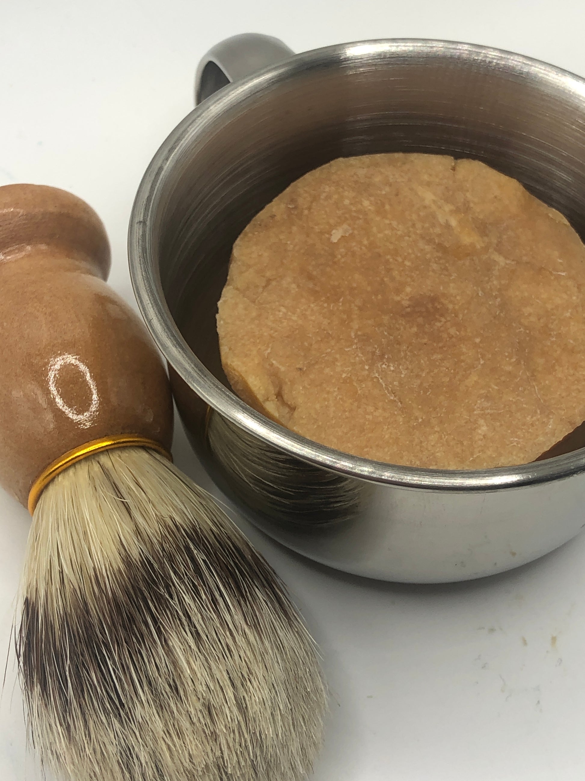 This soap is meant to be used in a cup or mug with a brush. Just add a bit of water, brush it around, and impressive bubbles and lather will build up. There is no added colorant, but it is lightly scented with lime, patchouli, and cypress essential oils, or lime and cedarwood essential oils. Stainless steel mugs and natural bristled brushes are sold separately.