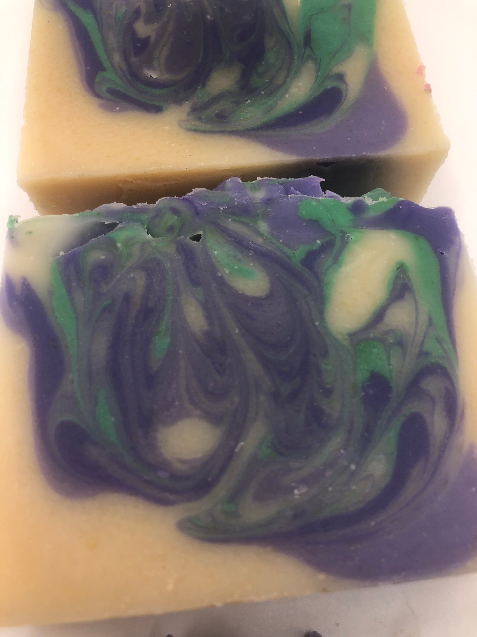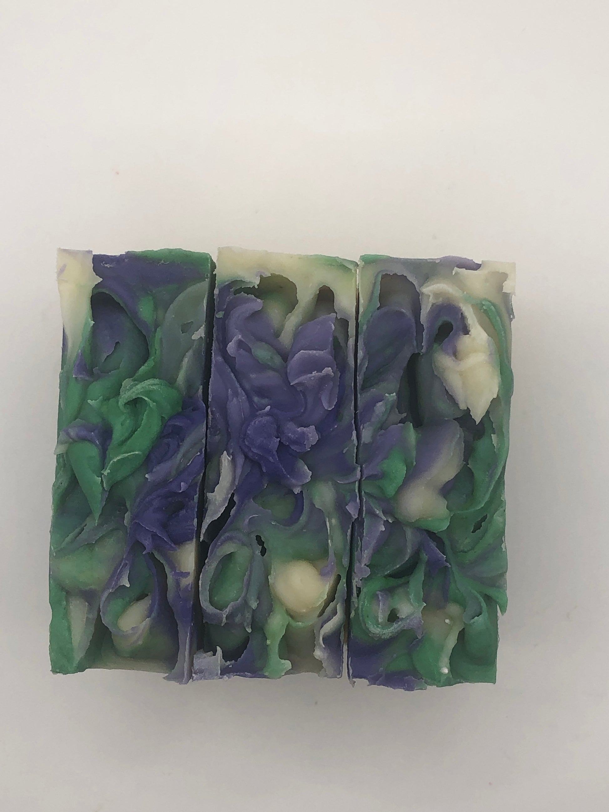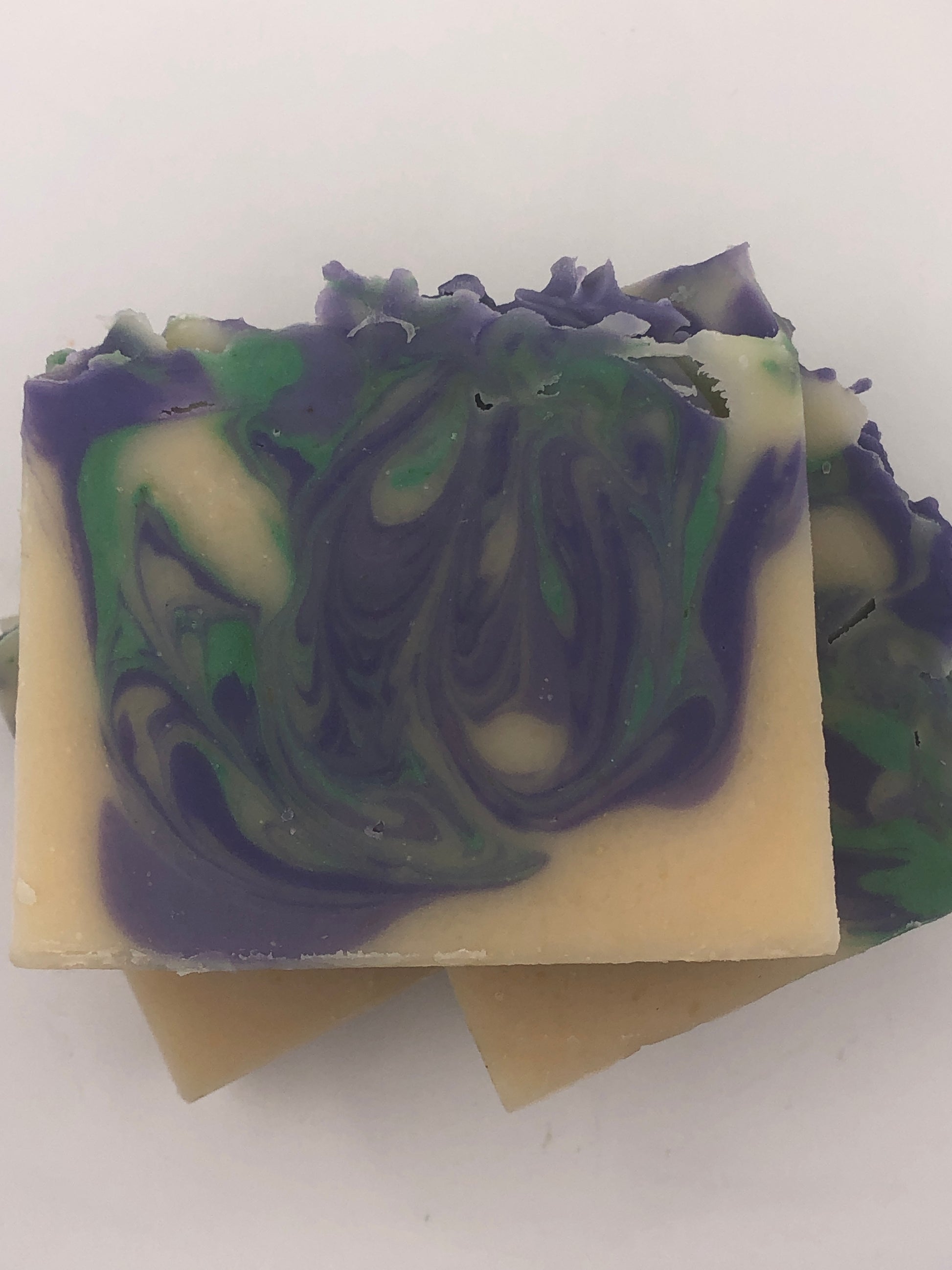 This soap is scented with a light lilac scent- a nod to lilac being the New Hampshire state flower. It also contains swirls of deep and light purple and foliage green- all made with micas and oxides.
